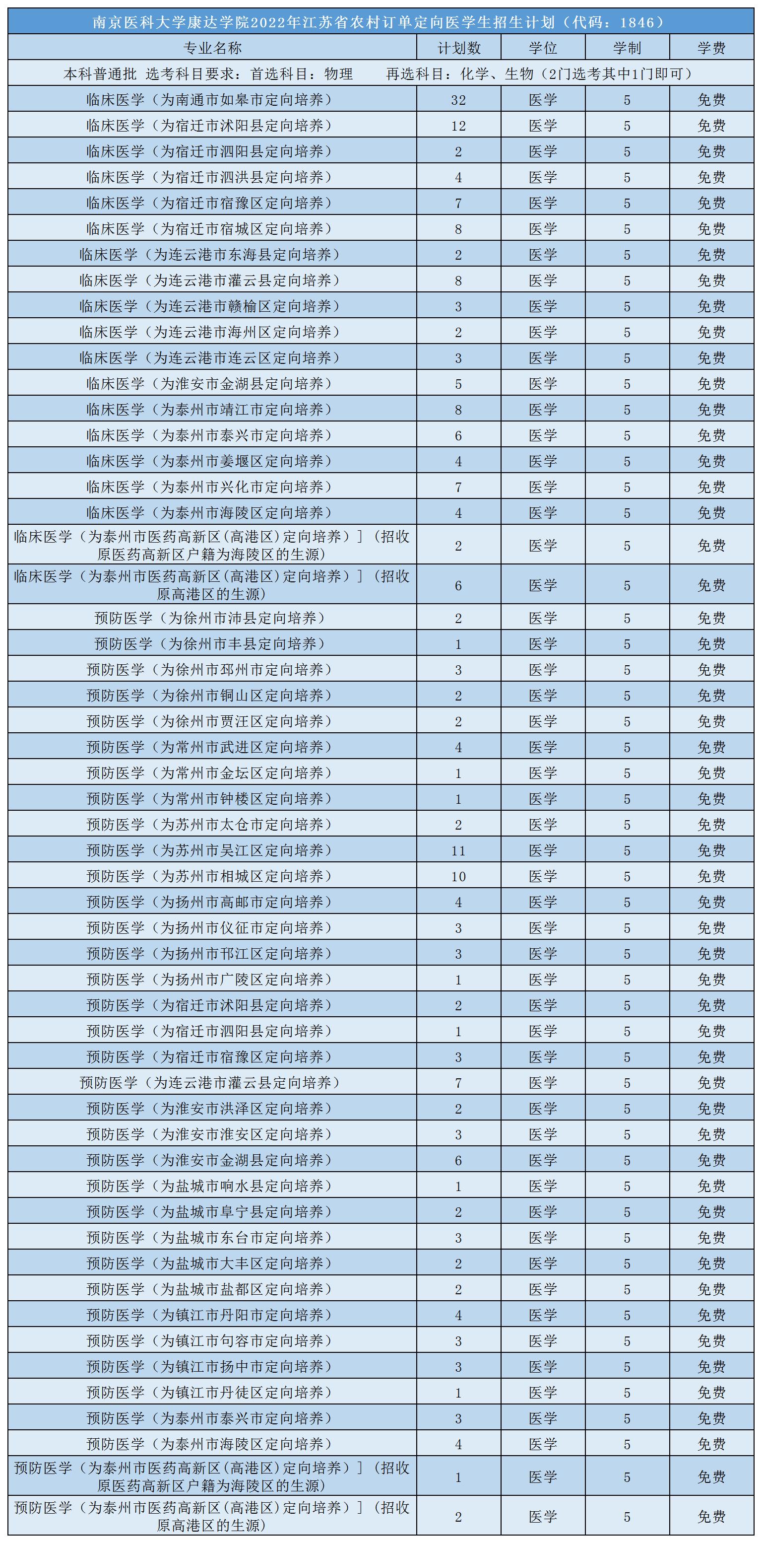 南京医科大学康达学院2022年江苏省农村订单定向医学生招生计划