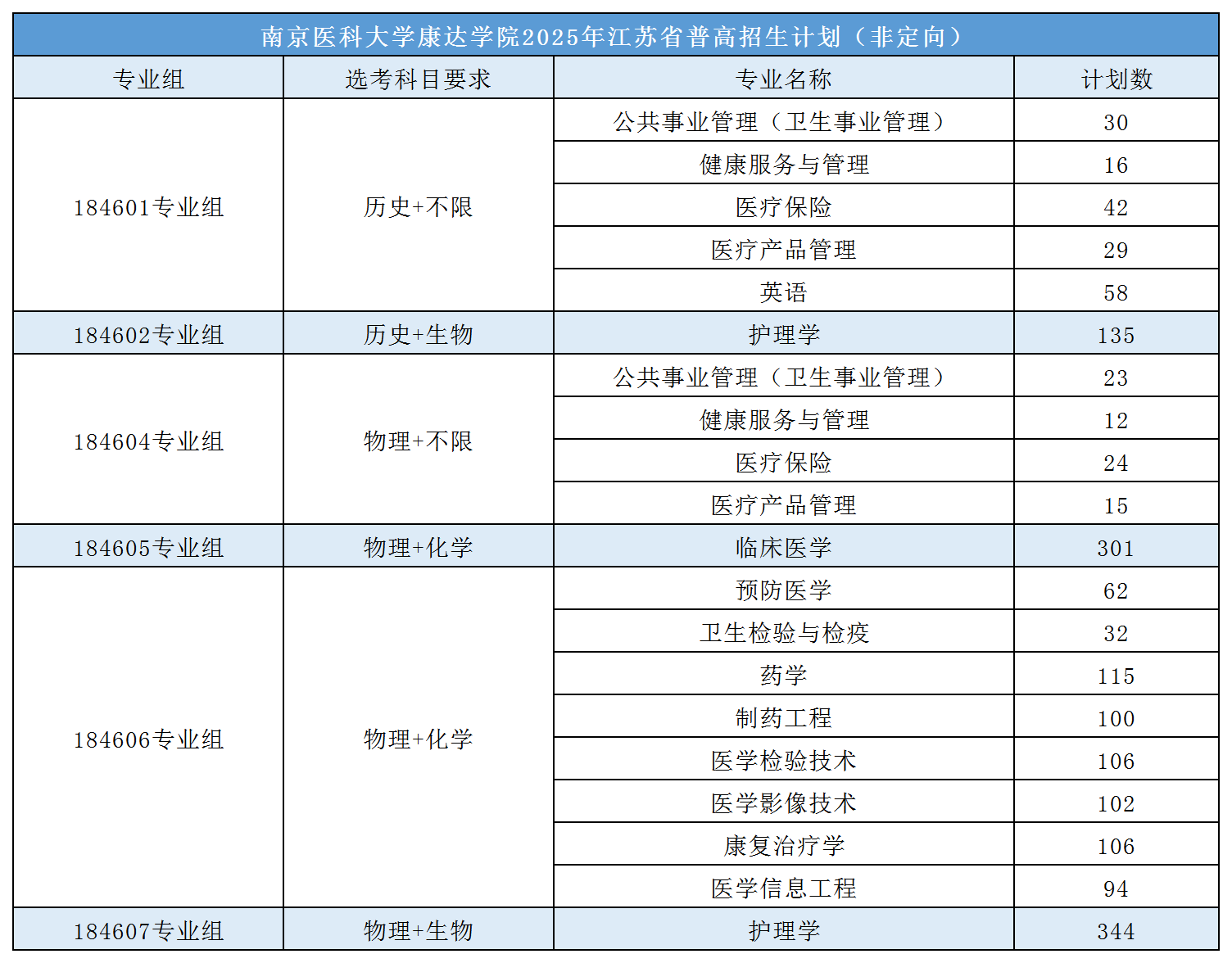 南京医科大学康达学院2025年江苏省招生计划(非定向)