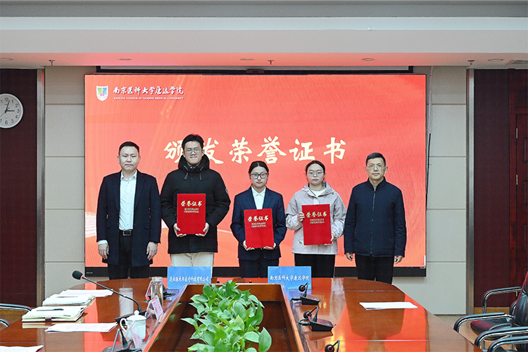 12月2日下午,我院“禾书”校友奖学金签约暨2025年度颁发仪式在行政楼422会议室举行。连云港禾书医疗科技有限公司总经理、我院2017届优秀校友许磊,院领导张鸿来、王磊,党政办公室、学生工作处及相关部门负责人和获奖学生代表参加了仪式。仪式由党委副书记、副院长王磊主持。