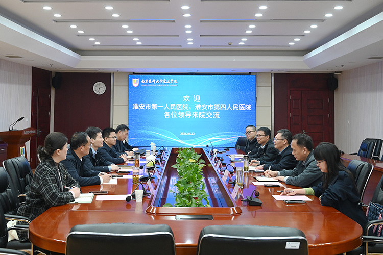 4月22日下午,淮安市第一人民医院副院长高勇、淮安市第四人民医院党委书记芦丰、院长姚仑,医院教育处、医务办、科教科负责人一行6人来院交流洽谈教学合作事宜。院领导王兴东,王磊,张怀平,教务处、学生工作处等相关部门负责人参加座谈。会议由学院党委书记王兴东主持。